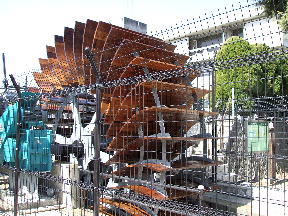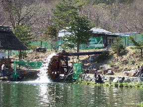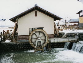(写真は開放型上掛け水車の実例。いい味でてます。)